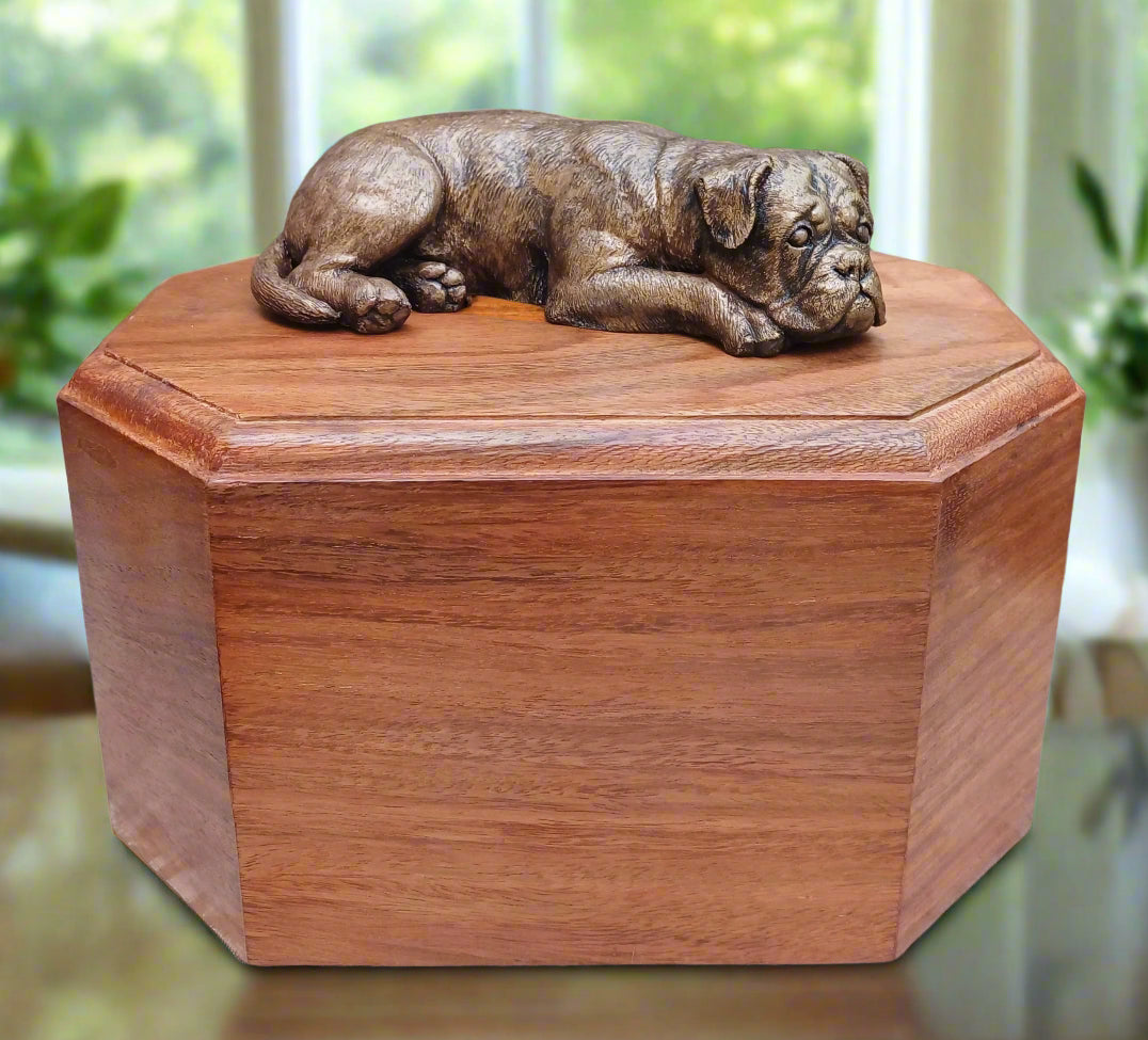 Featuring an exclusive hand painted sculpture of a Boxer ,our range of high quality solid wood urns are hand made using the best quality wood.The ashes can be placed in the urn via a bottom opening.
