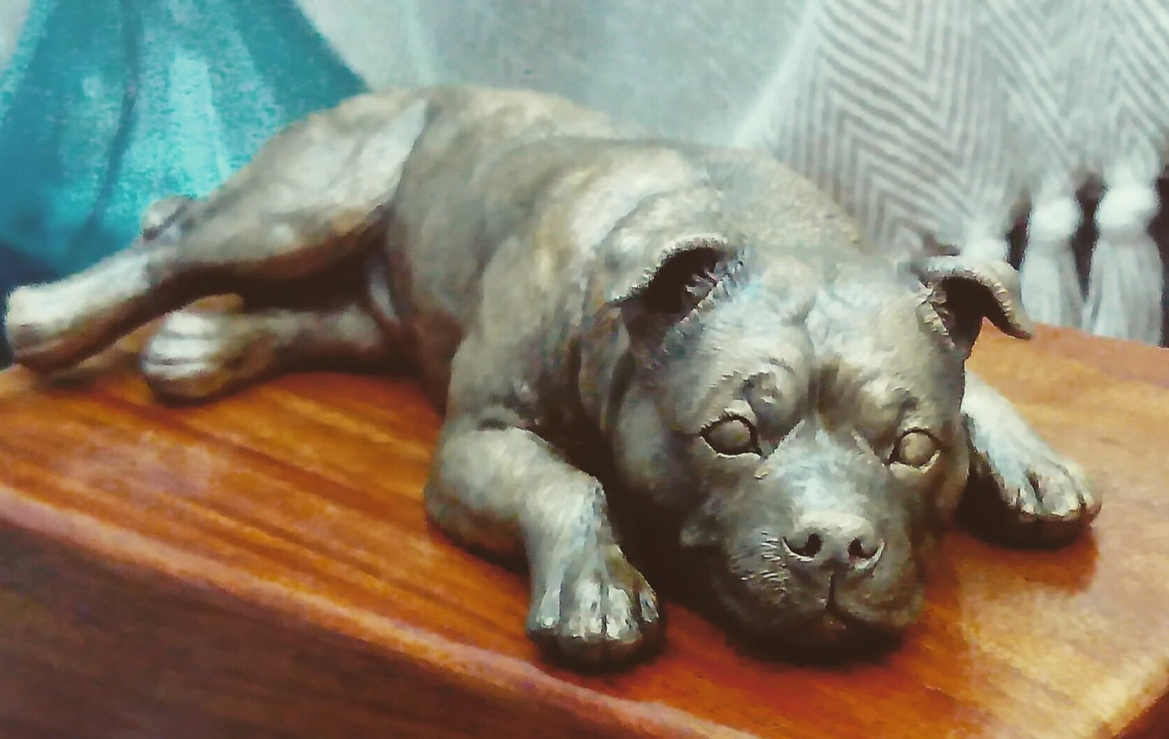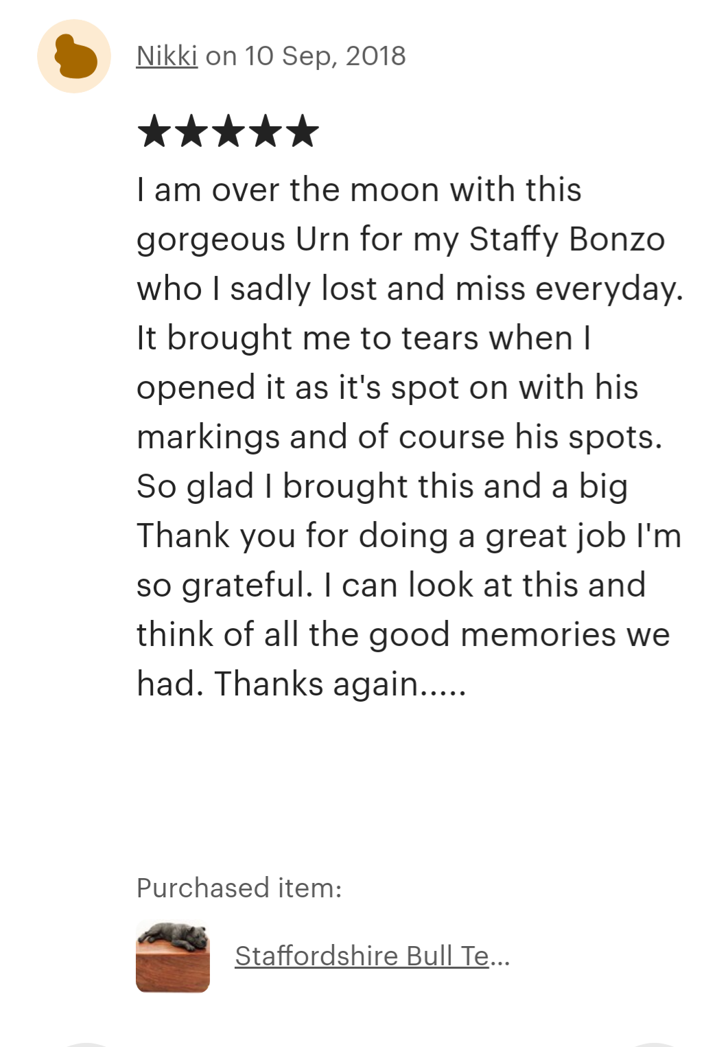 Honor your Staffordshire Bull Terrier with our beautifully crafted wooden cremation urn. Made of solid wood, it features an exclusively designed sculpture on top and is available in bronze or pewter effect. Keep your beloved pet's ashes with you and cherish their memory forever.